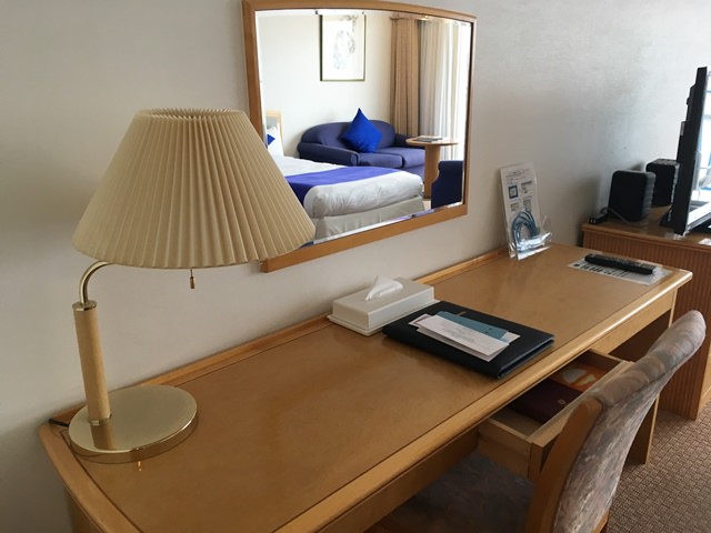 テレビの横にあるライティングデスクは十分な広さがあり、パソコンや書類を広げて作業をするにもちょうどいいスペースでした。