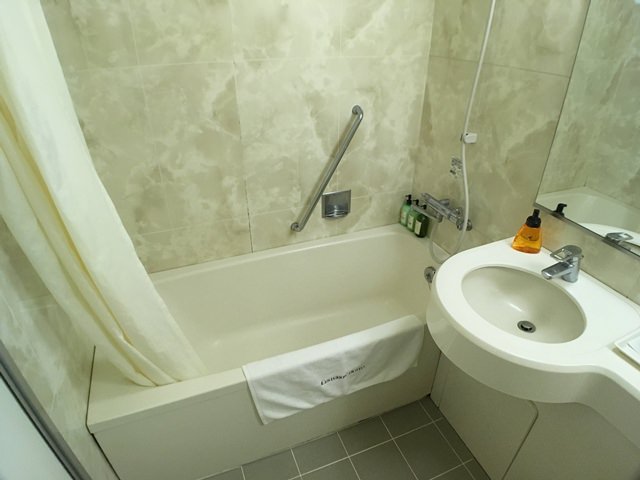 よくあるビジネスホテルよりはやや広めですが、2名で入るには少し狭いかもしれません。水回りはしっかりと綺麗に改装され、清掃も行き届いており、清潔感があります。