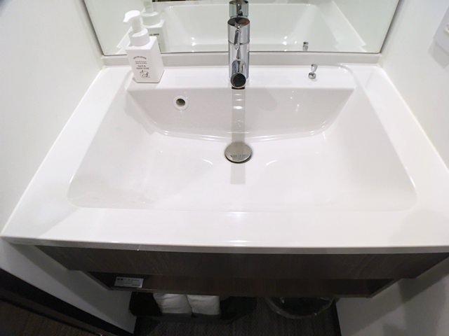 洗面台まわりには物を置くスペースがありませんが、下に棚があり、かごの中にさきほどの備品やアメニティが収納されています。