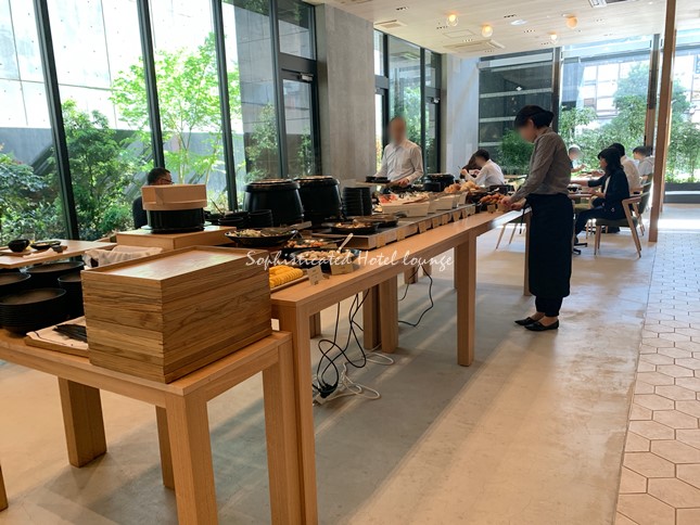 レストランは1階なので、見晴らしが良いわけではないのですが、ビルの周りにグリーンが植えられているのでとっても爽やかな雰囲気です。中央のテーブルに料理が並びます。