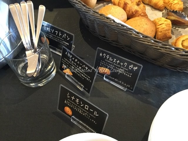 パンは全4種類(日替わり)から選べ、好きなだけ食べられます。宿泊した日には、シナモンロールと全粒ソフトパン、カクテルスナックピザ、AOPイズニーバター クロワッサンが並んでいました。