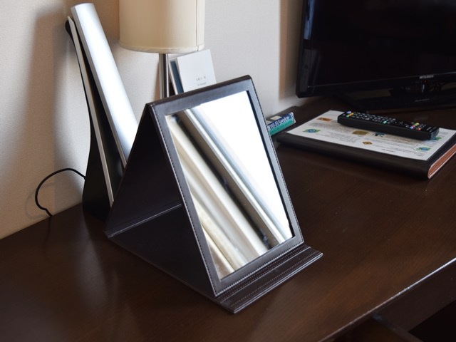 部屋に備え付けの鏡はありませんが、デスクの引き出しに卓上ミラーが入っていました。大きな鏡ではありませんが、化粧やコンタクトレンズの装着といった細かい作業には十分使えます。