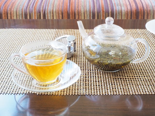 もちろんマイティーリーフのお茶も選べます。せっかくだからとオーガニックティーやハーブティーから、グリーンティートロピカルをセレクト。お代わりやお茶の種類を変えることはできませんが、大きなポットでの提供のため十分な量をいただけました。