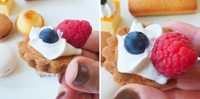 小さめのタルトはブルーベリーとラズベリーのダブルベリーで、爽やかにいただけます。大きく目を引くような生ケーキがあるわけではありませんが、小さいスイーツを少しずついただけるのは嬉しいですね。