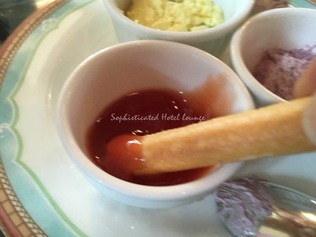 こちらはスコーンにつけるホテルオリジナルの紅芋バターとパインバター。ケチャップはグリッシーニ用です。