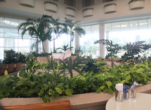 ラグナガーデンホテルは、本島北部のリゾートホテルに比べると、那覇空港からの距離が近い中部地区に位置しており、幹線道路沿いなのでまだまだ街中なのですが、アトリウムラウンジの中はトロピカルムード満点。