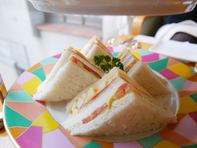アフタヌーンティーセットの一番下の段はサンドウィッチのお皿。卵・ハムのサンドイッチと野菜のサンドウィッチが2つずつ載っています。